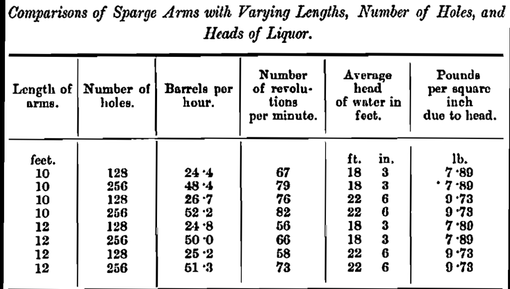 In using sparge arms over a mash-tun containing finely ground malt, we must remember that the main object to be studied in their construction is the prevention of heavy masses of liquor descending on the grist. It is because we should learn how to atomise the liquor that I have dealt at some length on the subject of head and pressure. The finer the spray, the less liability will there be of flooding our goods, and when we call to mind how prevalent is this inconvenient phenomenon even in the case of coarsely-ground grain, it will be doubly obvious how carefully designed the sparging plant must be in order to fulfil the conditions in demand. These are, of course, adequate regulation of liquor quantities, and the uniform distribution of such in the manner best calculated to avoid mash-tun disturbance. The most beneficial method of apportioning liquor quantities is, necessarily, best found out by direct experiment. Each brewer has different plant to deal with; his mash-tuns vary in dimensions, his sparge arms follow suit, and it is only by direct experiment that these quantitative factors can be regulated. I have, however, thought it worthwhile to furnish a guide in these matters, and have accordingly drawn up a table in which is shown the amount of liquor passed through sparge arms of varying lengths, with varying numbers of holes each sized to 0*032 inch, and travelling round at varying rates, under varying pressure heads. It seems clear to me that the brewer should know exactly and accurately the capacities of his sparge plant, and no better method of gaining this knowledge occurs to me than by constructing tables, from actual observation, of what takes place under given circumstances such as are represented by the number of holes, average head, and frequency of revolution, the arms are caused to make at the instance of the forces which play upon them.