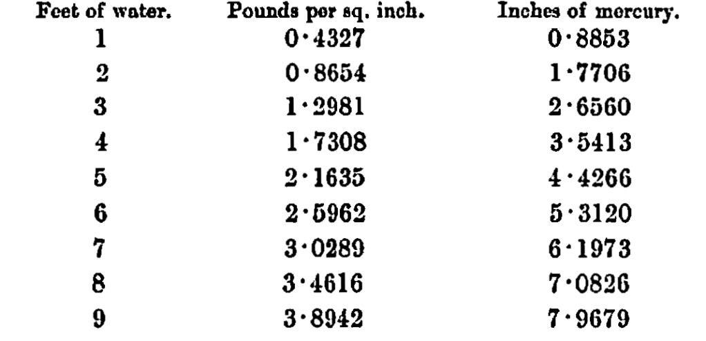 It will thus be perceived that by no means an unimportant factor is the maintenance of sufficient pressure, in order to ensure uniformity of flow and speed in the sparge arms; and, for this reason, I will devote a few moments to this topic. The “head” in feet may be readily converted into pounds per square inch. In rough and ready calculations, one often assumes that the head of water in feet is double the number of pounds per square inch pressure. This rule, however, is only approximate, and as the exact figures are easy of calculation, we might as well accustom ourselves to accuracy. Each foot of water corresponds to 0*4327 lb. per square inch, and in the following table I have given the equivalent pressure for depth of head, up to 9 ft.:—