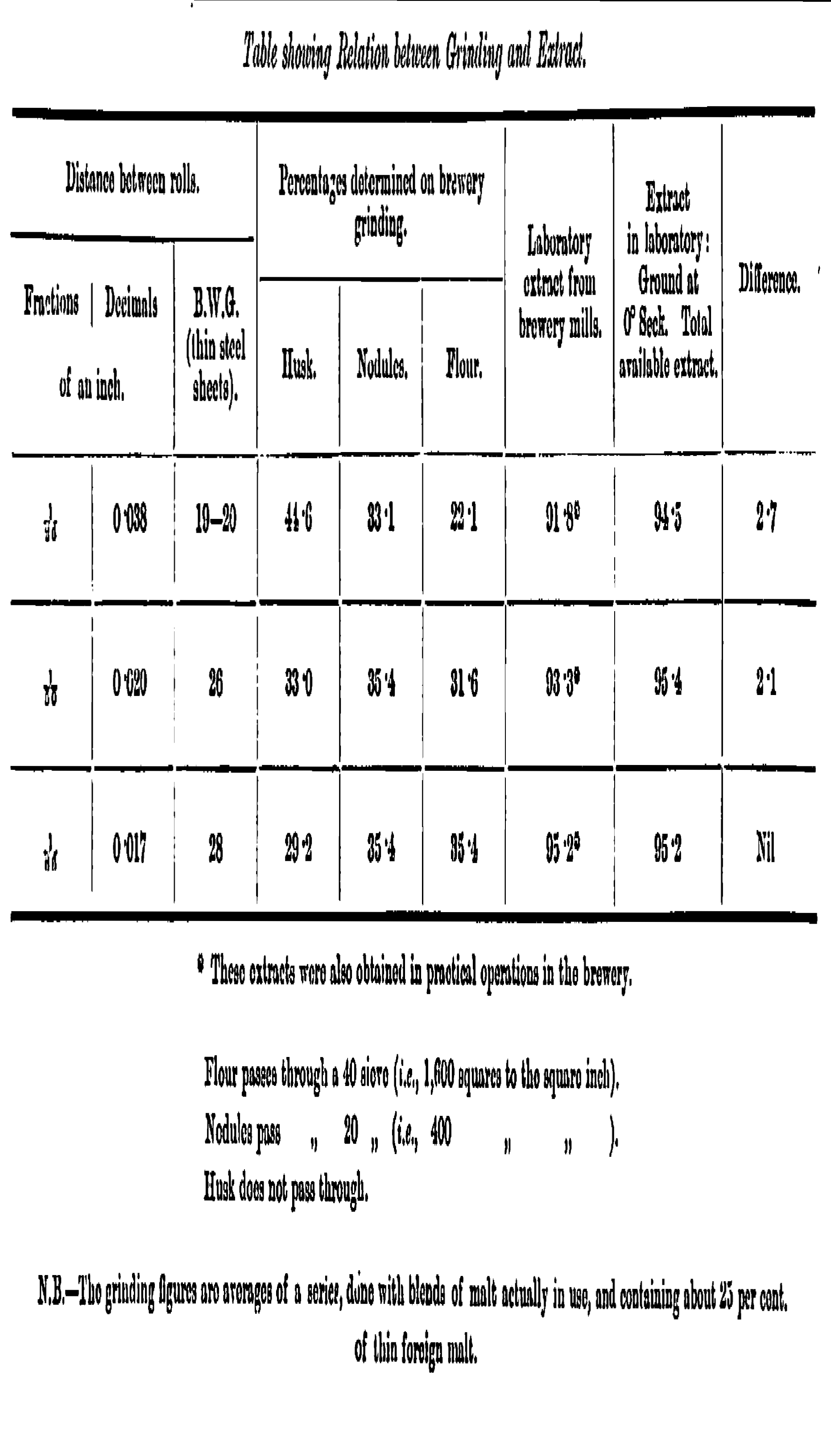 An ingenious French writer observes that those who depend on the merits of their ancestors may be said to search in the root of the tree for those fruits which the branches ought to produce. Be this as it may, it will be obvious, from the words I have quoted, that even a century ago the trend of educated opinion lay mainly in favour of fine grinding as a means of increasing the extract. Nowadays, as we go further, and roundly assert that the whole secret of high extract is centered in this fact The limits imposed upon the set of malt rolls were, and until recently always have been, dictated by questions of mash-tun drainage. This is the reason why, when many of us signed our articles of apprenticeship, we were taught that malt should not be ground, but merely crushed or cracked. This alone excuses the eccentricity of fluted rolls, once so popular. The traditions fostered by centuries of difficulty over drainage became a fixed and settled article of faith, and articles of faith in the brewing world suffer hard and lingering decease. There is, however, one solid consolation for all the many millions of good extract that have been lost on this tradition, and that is—the pigs and cows have, no doubt, hugely benefited there from. Yes, I repeat, the prime secret of high extract is fine grinding.
