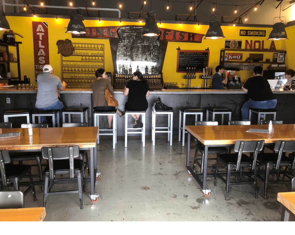 My friend and I visited Kingfish Ciders on Iris Ave. in Jefferson on a recent Saturday. It is located 2½ blocks from the River Road in South Port (between Ochsner Hospital and the Orleans Parish line.) There is sufficient off street parking and the cidery is located in an industrial metal building as are almost all new businesses these days. It was about 80o outside but inside, it was quite comfortable even with the door rolled up.