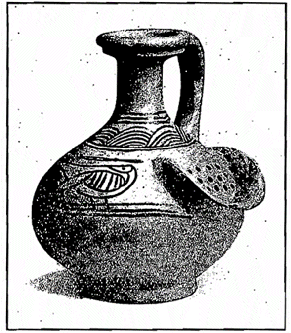 The dough for making beer was allowed to ferment until it had become highly alcoholic; it was dried in the sun, and then crumbled into a special mug, and water was added to it, which absorbed the alcohol. The beer, or “booza,” was poured off through the perforated outlet, which kept back the crumbled bread, and no doubt filtered the ” booza,” so that it would be nearly bright and slightly acid when poured off. ” Booza ” made in this way, will contain about 6 per cent, alcohol, and will be drinkable for about 4 to 5 days after making, but it becomes very acid after this time.