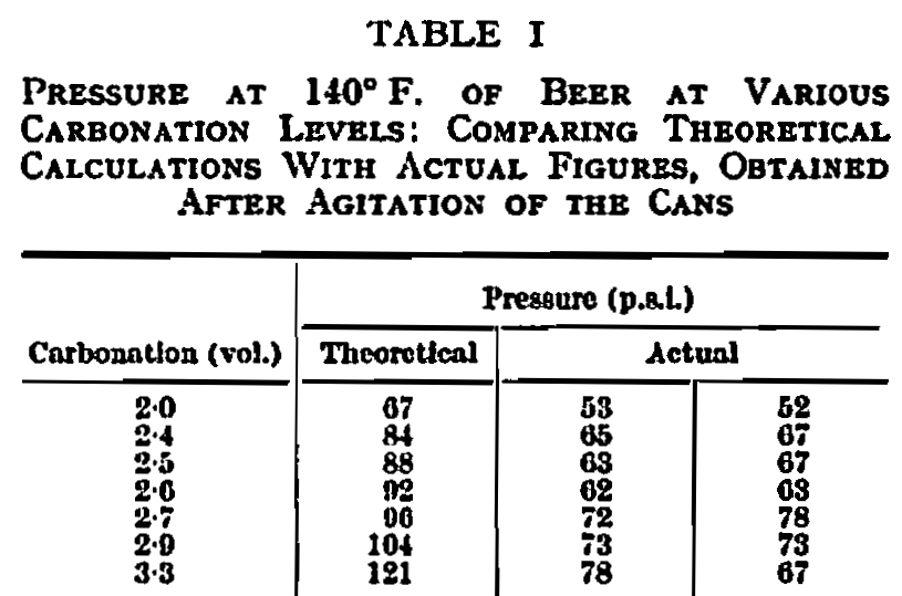 It is an accepted feature of the normal open-top can that, after the canning procedure has been completed, there is an internal vacuum, achieved by either hot filling or some means of mechanical vacuum closure. This internal vacuum naturally tends to pull in the can ends so that they are virtually fiat, or perhaps even show a slight concavity. If this is not so and the ends swell outwards, it is a recognized sign that the contents are unfit for use. When considering this type of container for beer, the first radical change in thinking and in can construction is concerned with this question of relative pressure. Not only has the can to withstand the continual pressure exerted by beer during storage at room temperature but, during the pasteurizing period, it has to withstand pressures which are very considerably higher. The theoretical pressure to be expected during a normal pasteurization at 140° F. can be calculated from Henry’s Law, which states that the partial pressure is proportional to the mass of dissolved gas. Figures for this theoretical pressure at various levels of carbonation are given in Table I, alongside figures which have been determined by practical experiment. These actual figures were recorded after the can contents had been allowed to reach 140° F. and after agitation. It will be seen that, whilst we have found that Henry’s Law is fairly closely obeyed at room temperature, the practical figures recorded at pasteurizing temperature are appreciably below those which have been derived theoretically. The reasons for this discrepancy are not fully understood but they are probably similar to those which govern wildness and gushing of beer, about which much has been written.1,4,14 However, despite this slight advantage in practical results over what would be expected according to theory, it will be apparent that very high pressures may be achieved. Other minor factors must be taken into consideration such as the partial pressure exerted by air residuals, and expansion of the pack which decreases headspace volume and the slight expansion of the container which has a reverse effect.