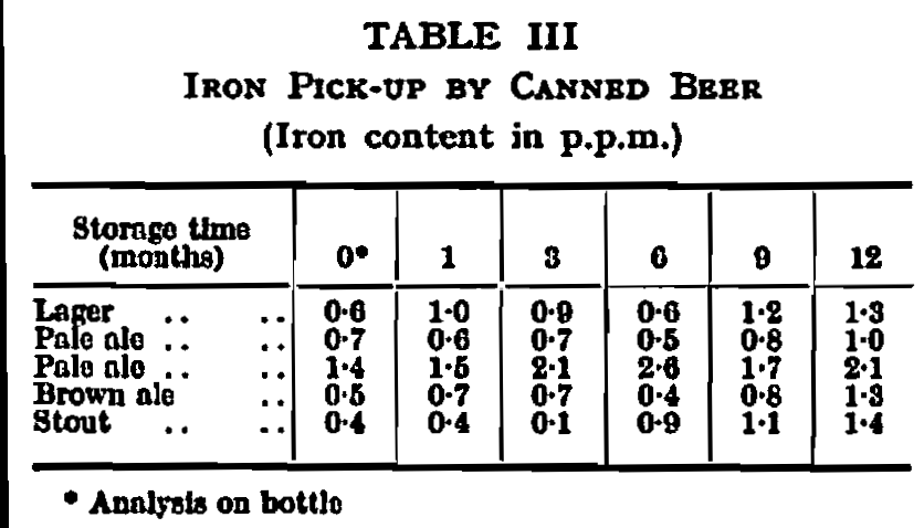 The degree of protection afforded by the lacquering system described above is illustrated by comparing metal pick-up figures with those quoted previously for a highly corrosive fruit pack in a fruit lacquered can. Analysis of beer from the container in current use has never shown a tin content higher than 0·04 p.p.m., and the average figure may be even lower. Some figures for iron pick-up during storage are shown in Table III from which it will be seen that, even after prolonged storage, contamination by more than about 1 p.p.m. is unusual.