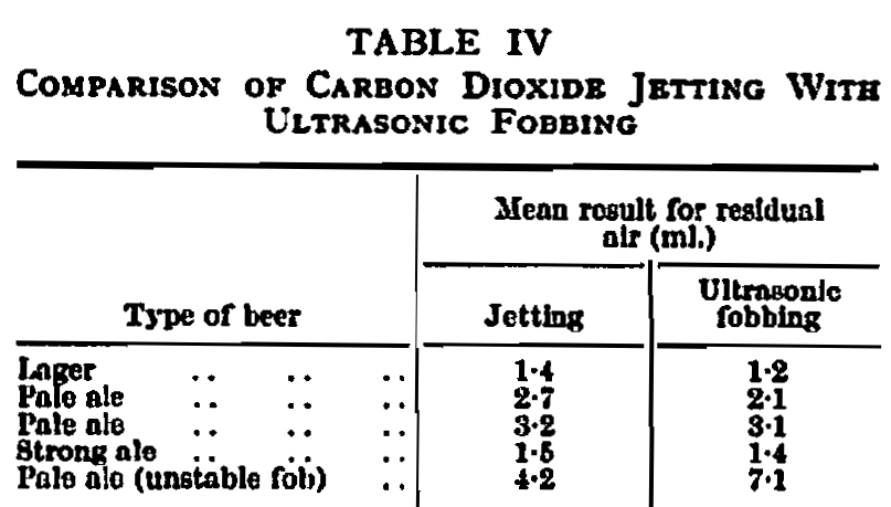 The next operation—fobbing—is undoubtedly that which, for a large majority of beers at any rate, determines whether the shelf life will be adequate. The effect of air on beer is well known and it is not necessary to reiterate, at this stage, the theories concerning oxidation hazes and flavor changes.6,8,10,12 However, in cans the exclusion of air is even more important since its presence will accelerate iron pick-up which, in turn, will hasten deterioration. In addition, high air will increase the pressure developed during pasteurizing which, as previously explained, is a critical factor already, without further aggravation. Carbonated beer when filled at a normal temperature of 36-40° F. is in a metastable state which normally prevents carbon dioxide gas from being released.14 This equilibrium can be upset by a plain shock or by providing nuclei for the release of carbon dioxide. “With bottles, shock is applied by the simple procedure of tapping, but this method would not be sufficient for open-top cans with their wide orifices, and the most usual method in this country, up to the present, has been some form of jetting to introduce carbon dioxide gas under the surface of the beer and provide the necessary impetus for the release of more gas, thus producing a foam on the surface. Recently the application of ultrasonic energy in industrial processes has provided a possible method of producing a shock-induced fob with beer cans. The ultrasonic device consists essentially of a generator connected to a magneto-striction transducer through a remote control box. A shoe is mounted on the end of the transducer which contacts the cans and, in that manner, transmits the energy. From observation, the main advantages claimed over carbon dioxide jetting are that the fob produced is more stable and consists of finer bubbles which, it is felt, may trap less residual air. Table IV gives air residuals determined on jetted cans compared with cans that have been ultrasonically fobbed and from these results, which were obtained under controlled laboratory conditions, it will be seen that there is a fair comparison at this stage. No marked advantage is yet shown by ultrasonic fobbing, but it should be remembered that this is still in an experimental stage and some improvement may be expected. An undoubted advantage, of course, is that no carbon dioxide gas is consumed.