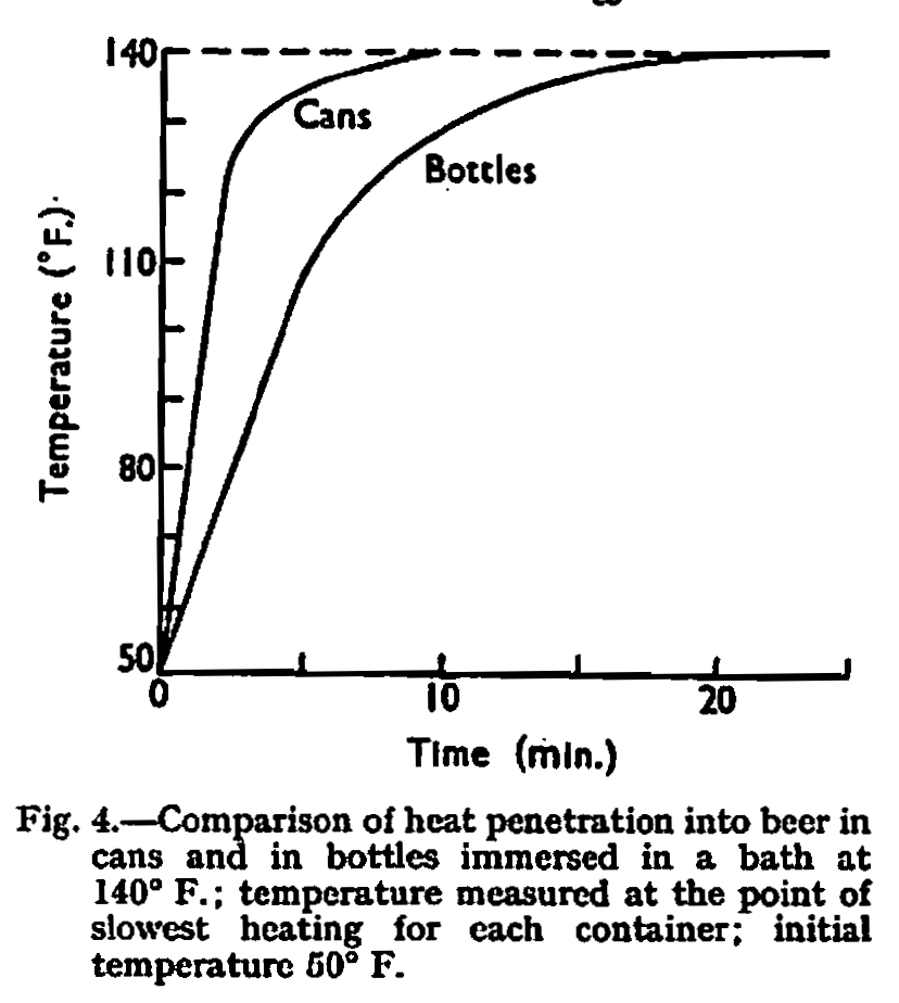 It will be seen from this graph that, whereas with bottles it takes some 24min. for the slowest heating point to reach bath temperature, with cans this state is achieved after only 10 min.