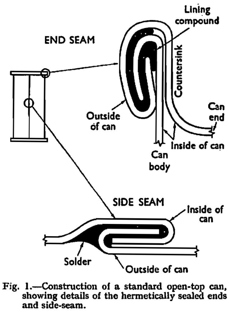 Can construction.—The open-top or sanitary can is fabricated from tinplate and consists of three components. First is the body cylinder, having an interlocking and soldered seam called the sideseam and second, the bottom or maker’s end which is mechanically seamed on to the body prior to leaving the can manufacturing factory. Thirdly, the top end, which is identical in construction to the bottom end, is supplied loose to the canner for subsequent seaming on to the body after the contents have been filled into the can; hence it is called the canner’s end and hence also, the derivation of the name open-top. The construction of such a can is shown in Fig. 1.
