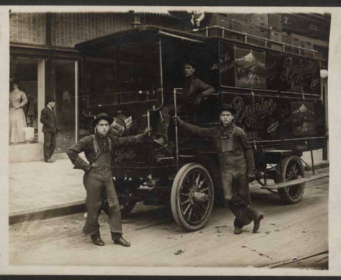 Note the leather aprons. Apparently hauling crates full of bottled beer took a toll on clothes. The ability of small trucks to efficiently adapt their carriage to specialized cargoes proved to be an important trucking advantage. In this case, we had stacking of crates and cases of beer two high.