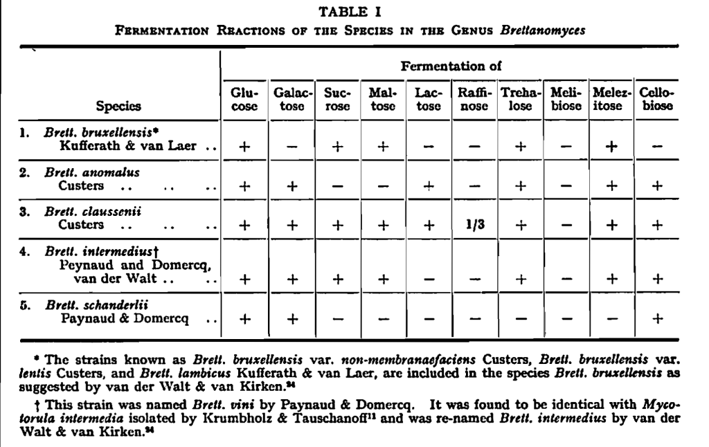 It seems strange that so many strains unable to ferment maltose (Groups 2 and 3) should be found in beer, but Custers isolated Brett, anomalus, which also is unable to ferment maltose, from English beer. It was because of this peculiar circumstance that Custers gave this species the name “anomalus.”