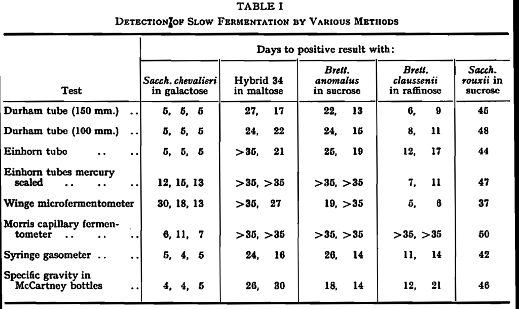 In the standard work on yeast classification, Lodder & Kreger-van Rij8 recommended the use of Einhorn tubes for the determination of fermentative ability. These tubes were incubated for 10 days at 25° C. Later the same authors9 advised the use of Durham tubes and these are now used by most workers; thus, Wickerham17 advised the use of Durham tubes with incubation at 25° C. for 24 days. The Durham tube and Einhorn tube methods are not equivalent, and neither may agree with quantitative tests using the van Iterson-Kluyver fermentometer, the Warburg fermentometer, or with tests based on determination of the amount of fermentation by chemical or physical methods; e.g., Stelling-Dekker14 found that the yeast Zygosaccharomyces japonicus (syn. Saccharomyces rouxii) was unable to ferment sucrose as judged by Einhorn tubes, but that it gave a slow non-delayed fermentation in the van Iterson-Kluyver apparatus, whereas Pappagianis & Phaff11 found that this yeast gave fast gas production after a long delay in Durham tubes. Thus, we can have negative, slow non-delayed, or fast delayed results for this yeast using different methods of examination.
