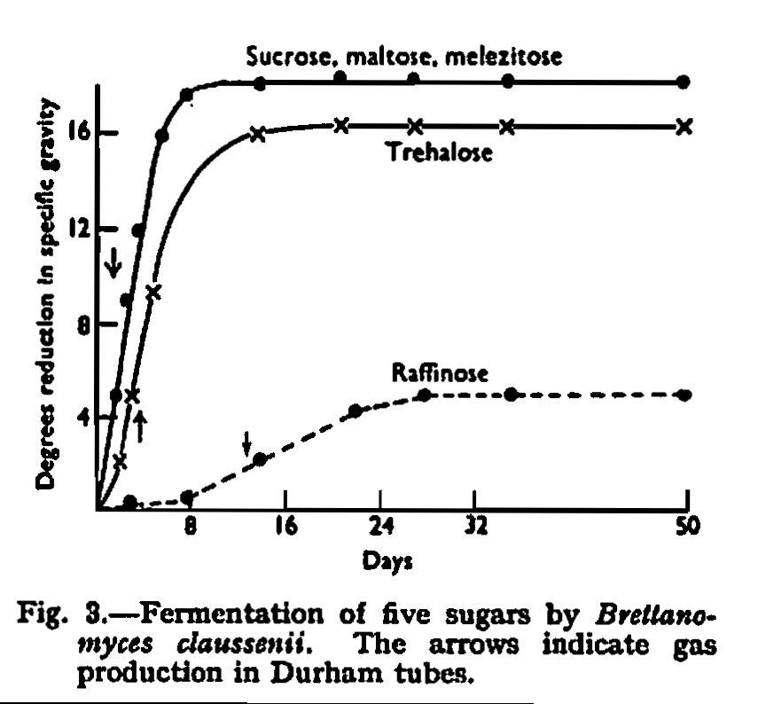 The new strain differed from Brett. claussenii in its inability to ferment melezitose, in that it could ferment maltose and trehalose only very slowly, in its ability to assimilate erythritol but not melezitose, and in its cultural appearance.