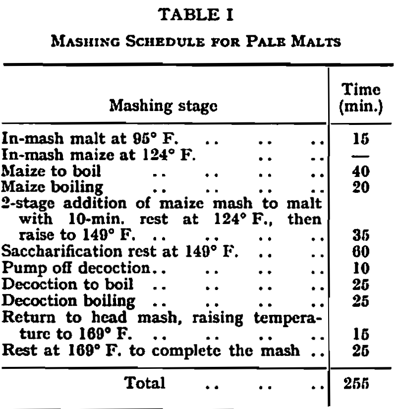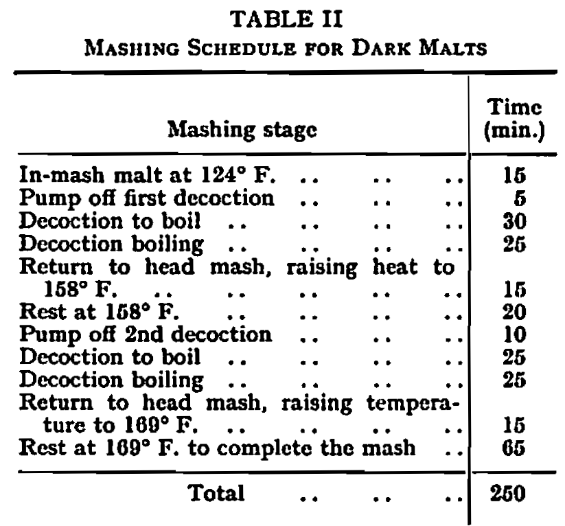The maize mash contained about 25% of highly diastatic malt to assist in starch liquefaction. Dark beers also conformed to the 4½ hr. timing, but with a single all-malt mash, and a typical schedule is given in Table II.