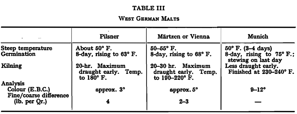 Malting.—The main malting procedures observed are outlined in Table III. Aeration in steep was always abundant and was usually in-place, but occasionally involved transferring to another cistern. All six makings visited had modern Saladin installations, although Munich and Märzen malts were still made on the open floor.