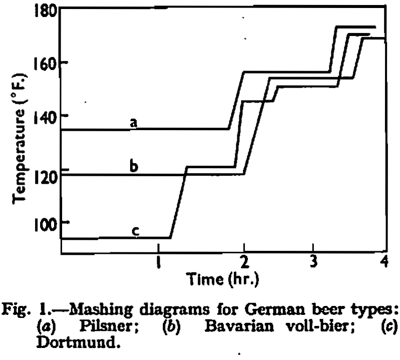 Brewing.—In a particular area there tended to be some conformity in the beer types produced and the mashing procedure adopted. All-malt mashes were enforced and again a common liquor treatment was to soften with saturated lime-water in the cold, then adding gypsum or calcium chloride in an extension of the softening apparatus; more simply, the gypsum was added dry to the grist. The flexibility of the process, whereby various beers of distinct character are produced by variations in the mashing procedure, is shown in Fig. 1, where the average mashing conditions for three typical pale beers are grouped together, ignoring the decoction details. This clearly underlines the desirability of obtaining good mash proteolysis where a full-drinking beer is required, the temperature chosen for saccharification being in rather closer agreement for each type.