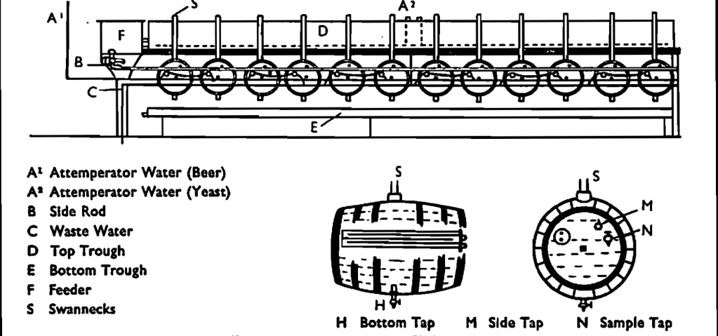 Introduction.—Surprise may be expressed that Burton Unions are not used to any appreciable extent outside Burton, because they have many desirable features. Naturally, they are particularly suitable for Burton beers and this suitability probably arises from the conjunction of the use of a very hard gypsum water and a high hop rate. Under these circumstances it would be easy to get too strong a bitter flavour, referring in this connection more particularly to draught beers or sediment bottle beers, rather than to all bright beers. After a brief description of the design and working of a Burton Union set, an attempt will be made to assess the disadvantages and advantages of the system in the hope of showing that the advantages outweigh the disadvantages.