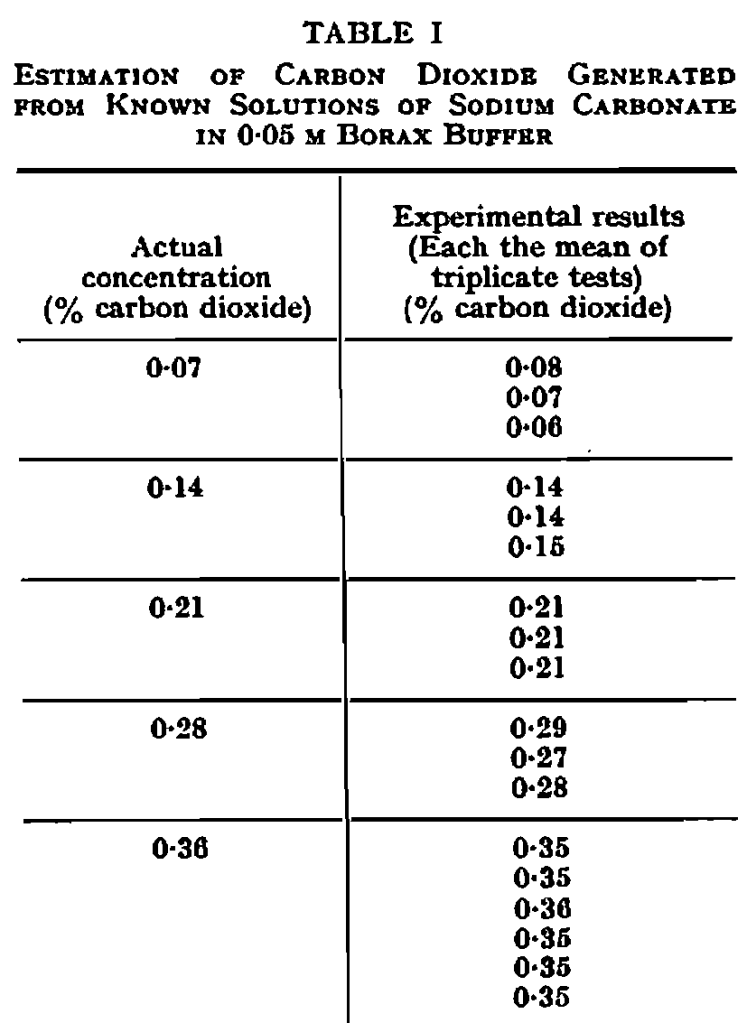 Method of analysis for carbon dioxide.—The investigation necessitated the analysis of samples for their carbon dioxide content, and this was carried out with the Warburg micromanometric apparatus.6 The principle of the method was to stabilize the .carbon dioxide as carbonate and then to regenerate it inside the Warburg apparatus by acidification, determining the carbon dioxide concentration by the change in manometric pressure. In order to obtain a stable carbonate solution, the pH must be brought to a high level, the limit depending on the carbonate concentration. The routine procedure was to pipette out a 4 ml. sample of the test liquid into 90 ml. of 0.05 M borax buffer and then make up the total volume to 100 ml. with buffer solution. The resulting solution of carbonate (not more than 0.004 M at pH 9.2) was completely stable. Bubbling during sampling was minimized, though not completely eliminated, by dipping the pipette into the liquid without applying suction. Portions (3 ml.) of the solution were analysed in triplicate in 20 ml. Warburg units, at 25° C, the carbon dioxide being regenerated by mixing with 0.2 ml. of 2 N sulphuric acid from the side arm. The manometric liquid was Brodie’s fluid; the flasks were calibrated with mercury, and Dixon’s nomogram6 was used to calculate the flask constants. It was necessary to subtract from the results a blank determined on the buffer solution alone. The water used in making the buffer solution was twice distilled, the second time in pyrex glass, and was completely freed from carbonate by passage through columns of Amberlite IR-4B(0H) and IR-100(H) ion-exchange resins. Borax buffer solution (0.05 m) gave a blank of 40-50 μl. Borax was chosen as the reagent in preference to sodium hydroxide because of the much higher blanks given by the latter. The accuracy of the method was tested by experiments in which known amounts of sodium carbonate were dissolved in 0.05 M borax buffer solution. The results are collected in Table I; the limit of accuracy is 0.01% of carbon dioxide (in the original sample). With the apparatus available, five samples, each in triplicate, could be analysed simultaneously, the group of determinations taking 2 hr. Tests showed that degassed beer, when added to known sodium carbonate solutions in borax buffer, did not affect the evolution of carbon dioxide in the course of analyses. The applicability of the method to beer was confirmed by checking it against the chemical method of the American Society of Brewing Chemists.1