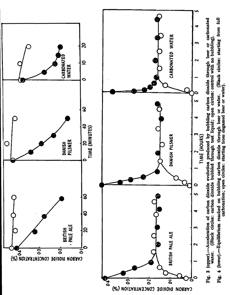 Rate of spontaneous carbon dioxide evolution from beer.—It was mentioned above that the rate of bubbling in a supersaturated solution of carbon dioxide in water is dependent on the number of bubble nuclei available. It is impossible to prepare two vessels so that they will each provide the same number of nuclei, and it is therefore necessary to eliminate these completely in comparing the behavior of different solutions. If the vessels are perfectly wetted by the solutions, no nuclei are present, and for vessels of similar shape the area of surface across which carbon dioxide can diffuse, i.e., the area of the top surface of the liquid, is the same in each case, so that the behaviour of different solutions may legitimately be compared under these conditions. In comparing beer with carbonated water, glasses were prepared by the following successive treatments, in order to promote complete wetting:
