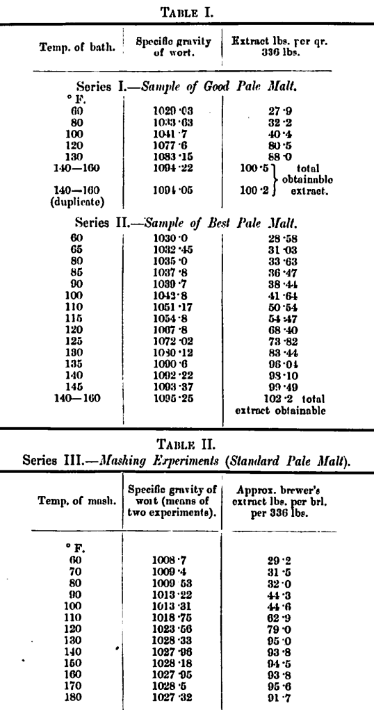The method of determining the extract may be dealt with and dismissed in a few words; it is the method, of which not a few modifications are extant, of mashing a definite weight of malt with an approximate settled volume of water at the temperature desired, sustaining the required temperature in a water bath for a given period, cooling to 60o F., and making up to a definite weight on a balance (the vessel, of course, being tared). A portion is filtered off from the well-mixed mash, the specific gravity is determined, and from this the volume of wort present, and so the extract. It is a good method, but, perhaps, gives somewhat high results as compared with sparging-out methods. One object at the time the experiments were conducted was to determine the degree of conversion of the starch of finely-ground malt at different temperatures. In each case the mash was kept constant at the stated temperature for two hours, and the extract then determined in the manner just described. Initial heats were obtained as near the required temperature as was practicable. The results are shown in Table I.