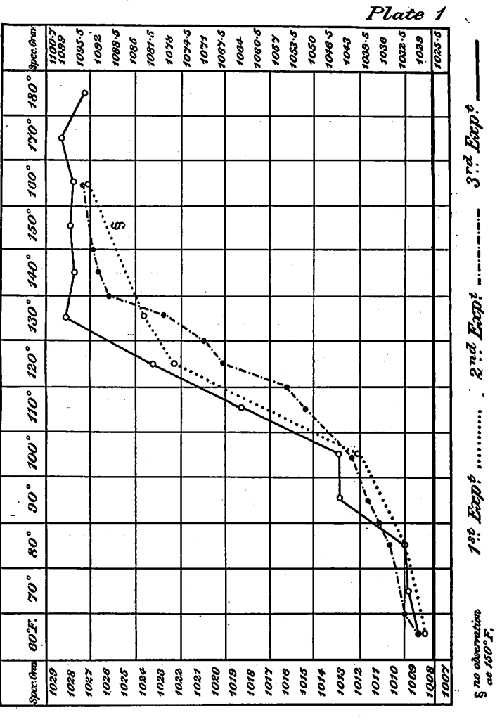 The results of all three series can, we think, be more graphically displayed as curves, and we have put thorn together in one chart (see Plate 1). The higher figures for specific gravity (right hand) refer to Series I and II, whilst the lower ones (left hand) refer to Series III. The curves are, however, comparable, the wort in Series I and II being practically 3–4 times as strong as Series III, the gravities proportioning in this way throughout.