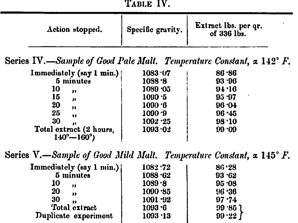 The method of determining extracts was next applied in a series of experiments, the object of which was to determine the rate at which the extractable matters are brought into solution from malt at temperatures known to be favourable, viz., from 142° F. upwards. The action was stopped when necessary by adding a small quantity of a solution of salicylic acid in borax, then the mash was thoroughly mixed, weighed and adjusted, and filtered. The malt was, as before, finely ground.