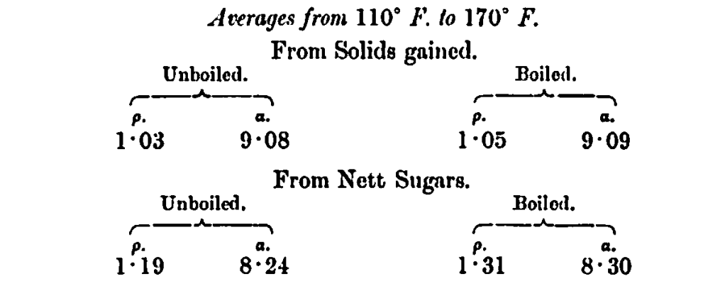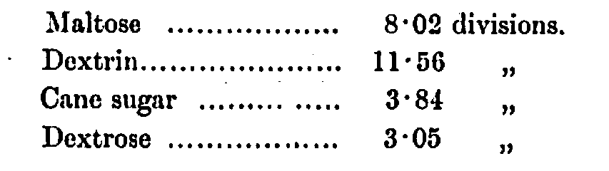 The figures from the solids gained indicate more dextrin and less maltose. The values a and p of the sugars fermented, as between the limits of 110° and 170°, approximate to maltose only.