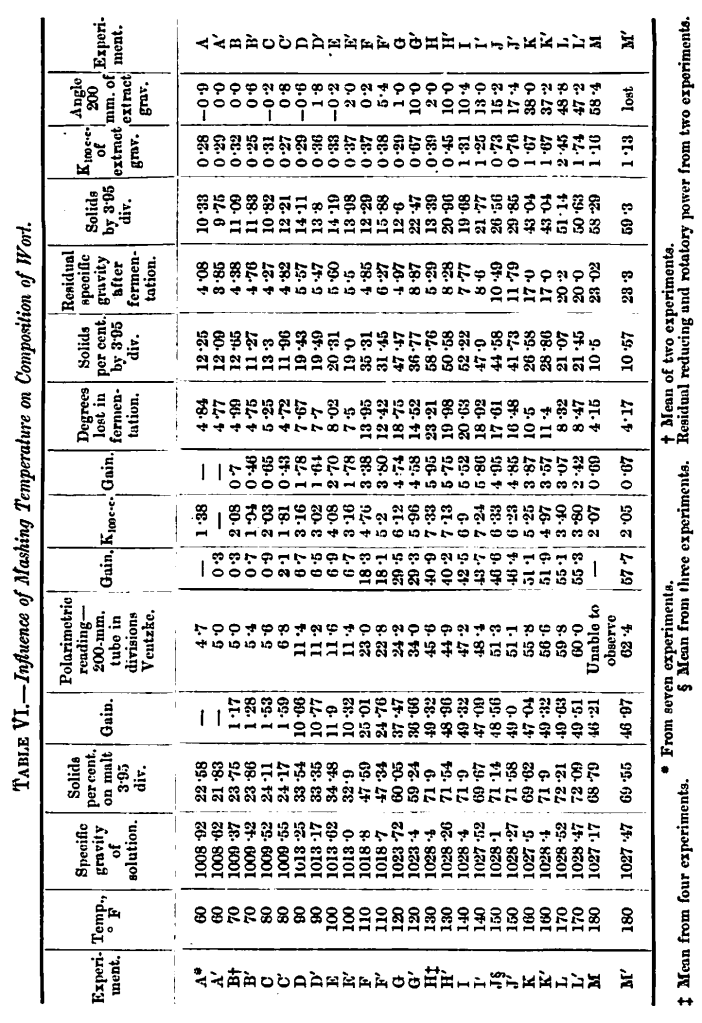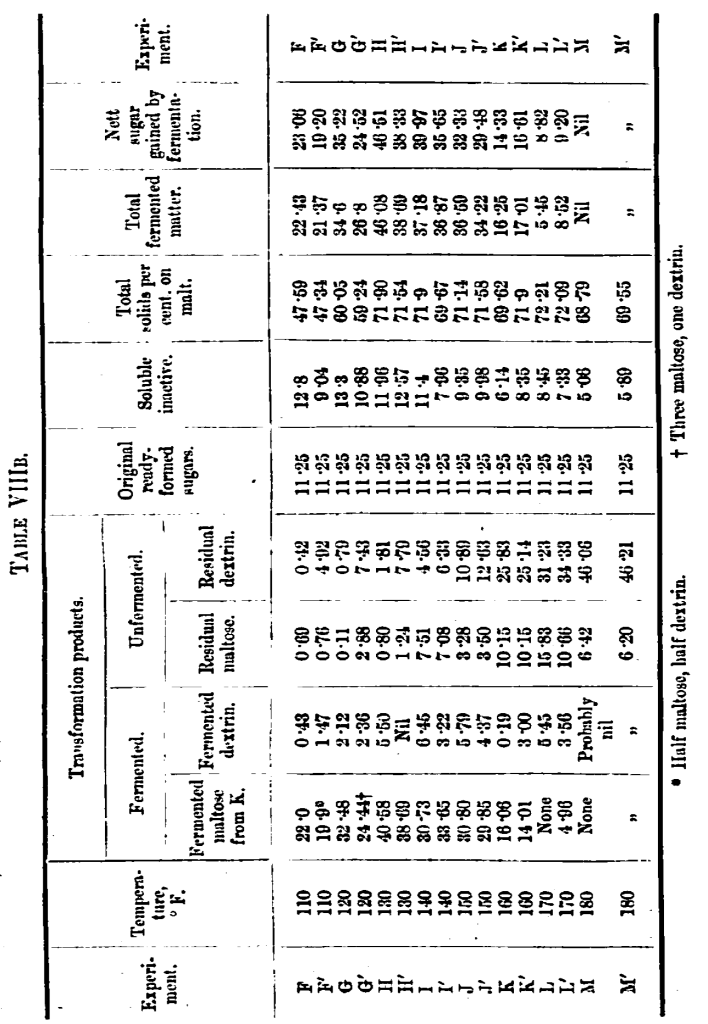 It should be noted, too, that where some diastase has been left (unboiled worts), the residual dextrin is far less than in the boiled worts F’, G’, and H’. By the time a temperature of 140° F. is reached, the diastatic power is presumably much modified in its action, but is still able to degrade dextrin or amyloins, and so leave less residual dextrin than the boiled portion I’. This seems to hold somewhat even at 150° F., but at this temperature the composition of the wort is very similar, whether boiled or unboiled, but there is a fresh complexion about the composition of the wort shown by the low figures for residual maltose. These results are the moans of several experiments, which on these points agreed well with each other. It seems as if the diastatic power had come to an optimum as regards relationship of fermentable to unfermentable and undegradable products, (degradable by fresh cold water extract, but not by residual diastase of the experiments) and it seems to mark 150° F. as an important point of temperature, which, indeed, we think, it has generally been considered to be. The degradation and fermentation of dextrin during earlier experiments has, doubtless, led to difficulties in interpreting the analytical data, whilst earlier still the apparent production of dextrose is a still more unsettling factor; but most of the experiments from 110° F. to the final temperature of 180° F. can be expressed in terms of maltose and dextrin, and they are thus calculated in the Table VIIIB.