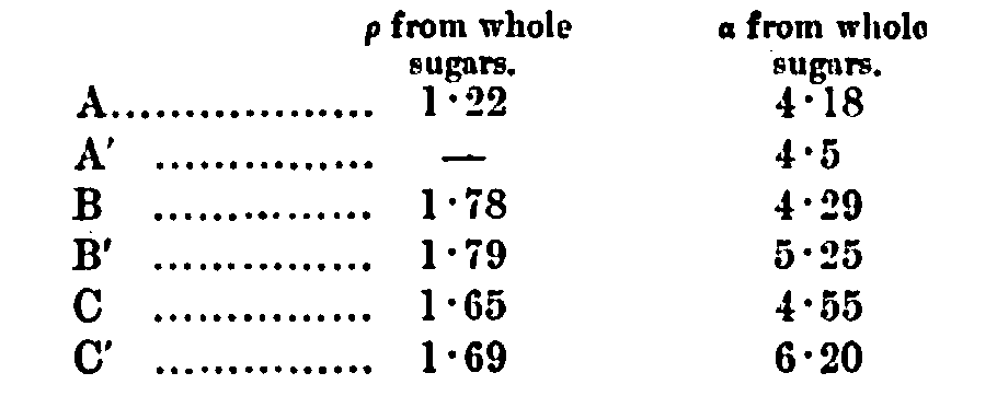 It seemed to us that further light could be thrown upon these results by calculating a value or index, which we will call p (CuO value per 1 gram of sugars fermented), and an optical value or index, a (rotation in Ventzke divisions for a solution of 1 gram of solids per 100 c.c. taken in a 200-mm. tube); the figures obtained are shown in Table VII, and some interesting points have thereby been brought to light, and not susceptible of easy explanation.