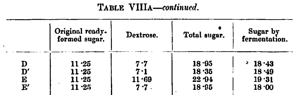 We now come to F and G experiments at 110° F., and find that the boiled worts F’ and G’ are not calculable in terms of maltose and dextrin. The assumption that suits the case best is that dextrose was formed in F’ in the proportion of one of dextrose to one of maltose, and in G’ one of dextrose to three of maltose. This was foreshadowed by the a and p values for sugars fermented shown in. Table VII.