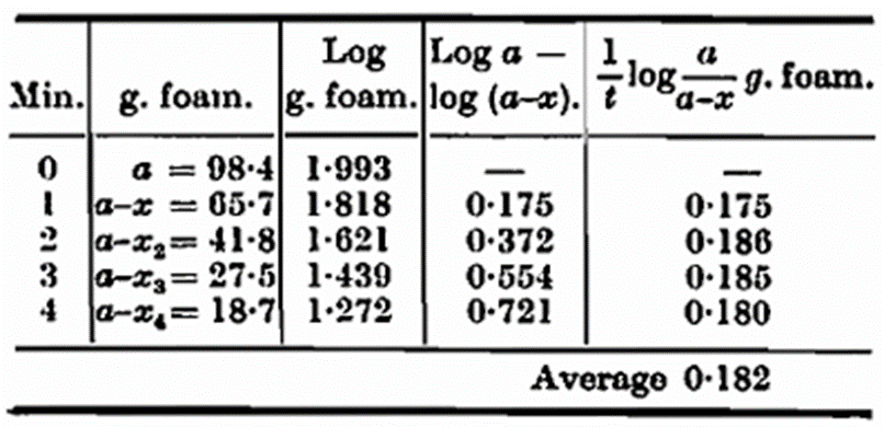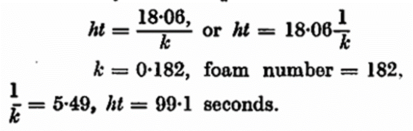 The logarithms of the weights vary linearly with the time, and k is calculated by dividing the differences of the logarithms by t. The calculated value of k normally shows a variation of ± 5 in the third decimal figure, the first value being the higher, the latter somewhat lower. One thousand times k is called the foam figure; this figure is inversely proportional to the stability of the foam. To obtain direct proportionality Helm and