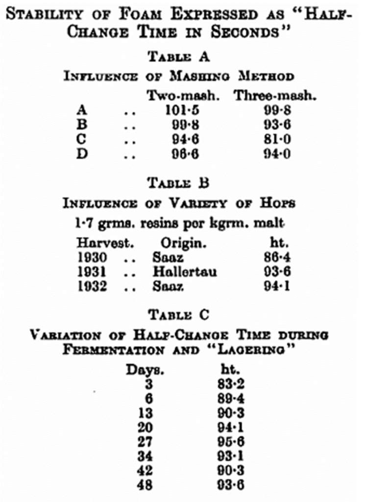 In examining the influence of the variety of hop, Saaz hops, 1930 and 1932, and Hallertau, 1931, were used. When the hop rate was kept constant, the two latter lots gave beer with a better head-retention than beer brewed with the 1930 Saaz hops. The quantities of bitter resins kept constant gave the same result; hops from the last two crops were decidedly the best. This indicates that the change which the bitter resins undergo during storage is a factor of importance (see Table B).