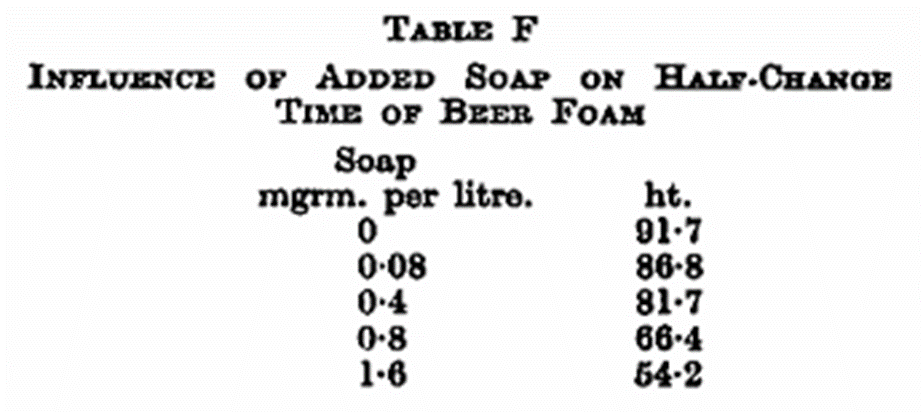 Fats and soap, even in very small quantities, greatly reduce head-retention. The action of soap is about 10 times as strong as that of fat; 1 mg. of soap added to 1 litre of beer causes a reduction of the half-change time from 92 to 62 seconds. This action is, of course, well-known, and it shows how dangerous it is to clean beer glasses in soapy water (see Table F).