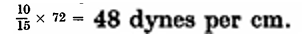 If, on the other hand, the size of the bubble is kept constant, the pressure in the bubble is proportional to the surface tension of the liquid. Thus, Lord Raleigh showed that if two equal bubbles—one of soap and one of saponin solution—were blown on two tubes and the tubes were connected, the saponin bubble contracted and blew air into the soap bubble. This result was to be expected from the fact that the surface tension of the soap solution is considerably less than that of a saponin solution of equal concentration. One of the quickest methods of measuring the surface tension is based on the same principle: From a capillary tube immersed in a liquid, air is bubbled until the pressure has diminished so much that new bubbles cannot be formed. On determining this pressure in pure water, and then in the liquid of which the surface tension is to be determined, the unknown surface tension is easily calculated. With the Cassel apparatus which is used at the Tuborg breweries, the formation of bubbles in water stops at about 15 cm. water pressure, whereas in beer the limiting pressure is about 10 cm. The surface tension of water being of72 dynes per cm., the surface tension of beer, according to the above relation, will be: