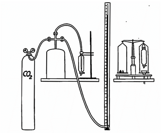 The method of determination of head retention capacity worked out by us is based on the following principle: At a given temperature a certain volume of foam is formed from a known volume of beer by blowing carbon dioxide of constant pressure through a Chamberland filter. At determined intervals the residual foam is weighed in the manner described. The temperature being of great importance, the beer is stood for several hours in a water thermostat at 68° F. (20° C), and the measurements are carried out in a room where the temperature is automatically regulated to the same degree. These precautions are necessary for exact determination; for less exact purposes a constant room temperature may be dispensed with. The carbon dioxide pressure is easily kept constant at 175 cm. of mercury by means of a container with a volume of 25 litres.