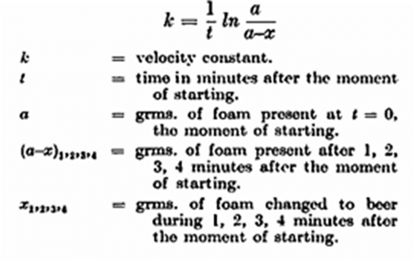 To determine the head-retention capacity 200 gm. of beer are weighed into the separating funnel. The foam is formed by blowing carbon dioxide through a Chamberland filter immersed in the beer. The funnel is suspended from a specially adapted balance; the beer is separated from the foam, at the same moment a stop-watch is started and the weight of the foam is determined to l/10th gm. At intervals of exactly one minute the accumulated beer is run off and the funnel again weighed. Five such determinations may be made before the foam has collapsed to about 10 gm. By means of this method it has been found that at any moment the velocity of foam collapsing is proportional to the amount of foam present at that moment. This is analogous to a well-known phenomenon in physical chemistry; the so-called reaction of the first order, that is, a reaction in which a single substance undergoes change. The velocity of such a reaction is easily calculated from the following formula: —
