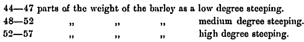 German brewers name the absorption of moisture in steeping by degrees. They speak of high, medium, or low degree of steeping, and denote an absorption of:—