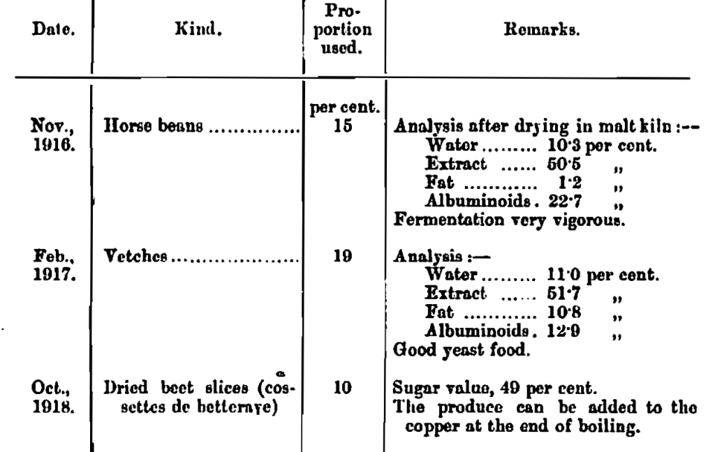 The prices paid for the malt substitutes were very high. The vetches fetching 350 francs per 100 kilograms, and the beans, 600 francs. But some of those with a high albuminoid-content proved of value as yeast food in the very thin worts, in this respect counter-balancing the disadvantages of high percentages of water and fat.