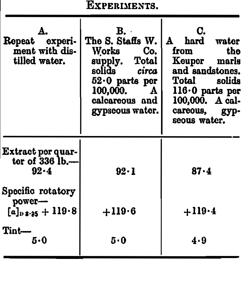 This suggestion was the basis of an experiment with some more of the malt of the earlier malting, using three different waters (otherwise Committee method), and the results are tabulated with remarks on the character of the wort, obtained. It will be seen that the writer (loc. cit.) was partially correct in his anticipation of what would happen :—