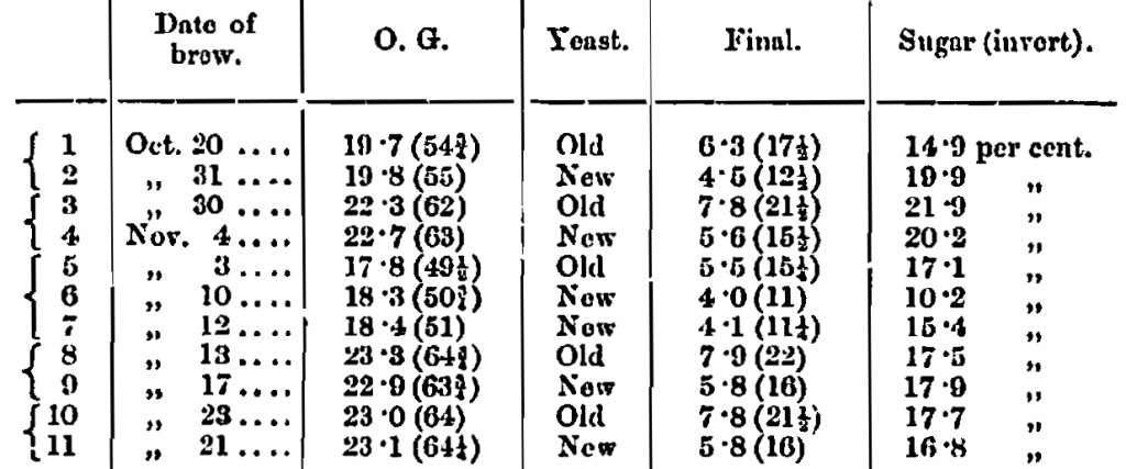 In the autumn I had some slight difficulty in getting the beers to fine readily, aggravated, no doubt, by a sudden occurrence of cold weather. I never satisfactorily explained the cause of this difficulty, but in trying to overcome it I increased the sugar percentage again, and also tried a change of yeast, from the same brewery from which I had obtained that I had then been using for eight or nine months. The sugar made a considerable difference to the brightening of the beer, but the change of yeasts had no beneficial effect. This new yeast was worked side by side with the old for a month or more, and the difference between the attenuating power of the two yeasts will be seen from the results given in the table.