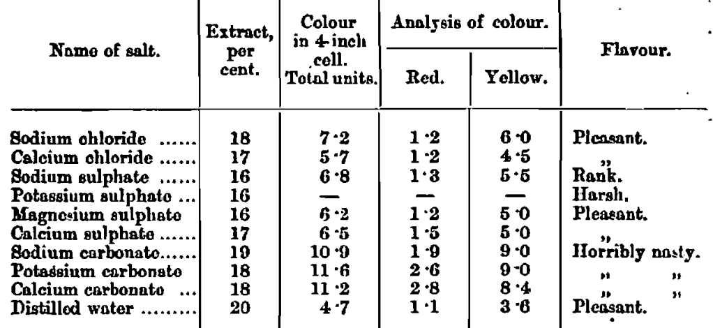 The following experiments were undertaken some years ago with a view to getting some definite idea of the action of the various salts occurring in brewing waters upon hops. Both as regards the extractive properties of these salts, as well as the flavour and colour of the extracts so obtained, several experiments were made of which there is no occasion to give a detailed account, I have therefore taken the mean values of such experiments, which are given in the annexed table.