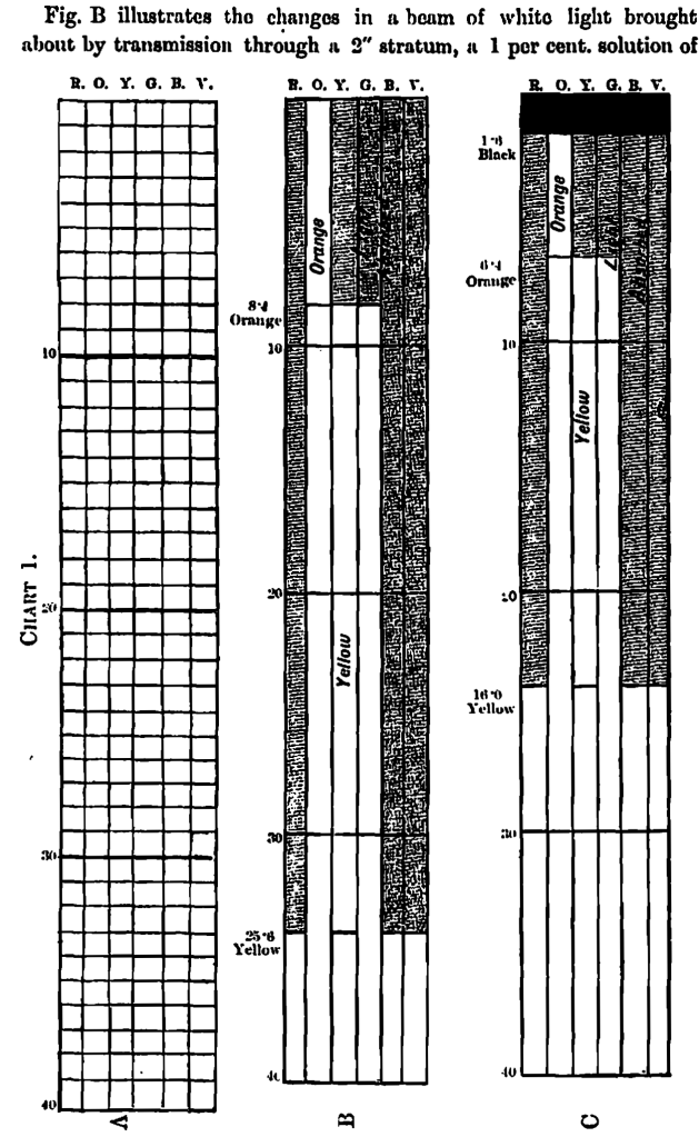 Fig. 13 illustrates the changes in a beam of white light brought about by transmission through a 2” stratum, a 1 per cent. solution of cararmelised sugar (No. 2 on our list), showing the darkened portions of the red, green, blue, and violet rays as absorbed, leaving 25∙6 units of yellow and 8∙4 units of orange in preponderance, and colouring the whole beam in these proportions.