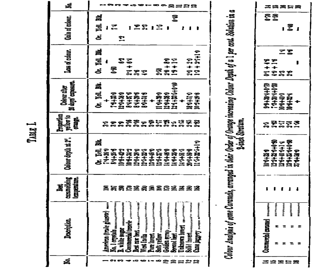 Even after making allowance for this difference in proportion, the commercial caramels do not compare favourably with the laboratory-prepared examples from sugars, except in the case of No. 18, which shows a much higher value in orange colour depth than the others; but this is coupled with a low proportion of yellow to orange. No definite conclusions can, however, be drawn, as neither the materials from which the commercial caramels were made, nor the conditions of their manufacture, were disclosed.