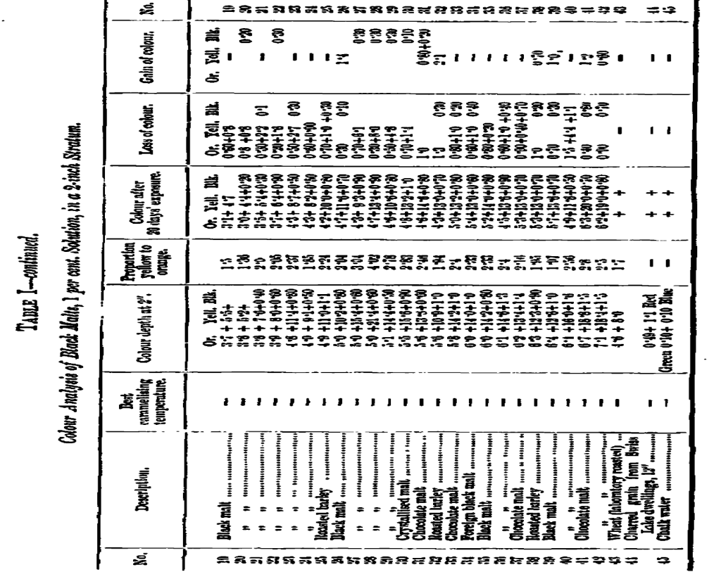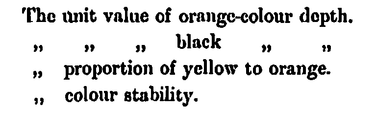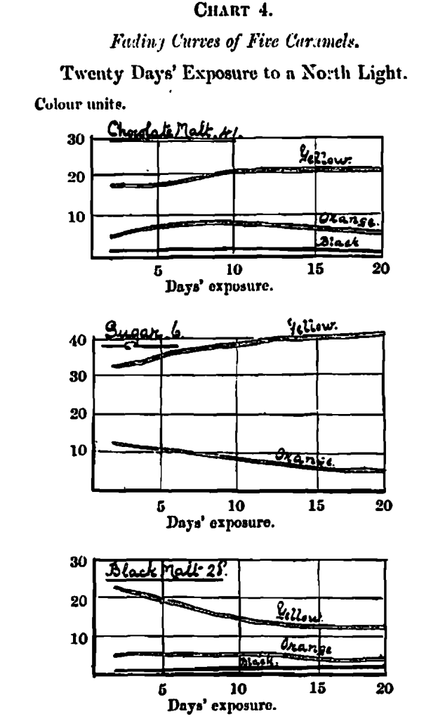 With these remarks I should place considerable value on a high proportion of yellow to orange, because it has already been demonstrated to be an element of intrinsic worth in pale malts, as well as in the baking value of flours. I also consider that colour stability should take a high position, bit have not yet sufficient data to venture on any expression as to the order of merit between the rate of fading, the proportion of yellow to orange, the colour depth caused by the orange factor, the colour depth caused by the black factor, and have no doubt but that an examination of those caramels and roasted malts which have proved their intrinsic worth by commanding the best prices in the market, would go a long way towards the construction of a scale of merit.