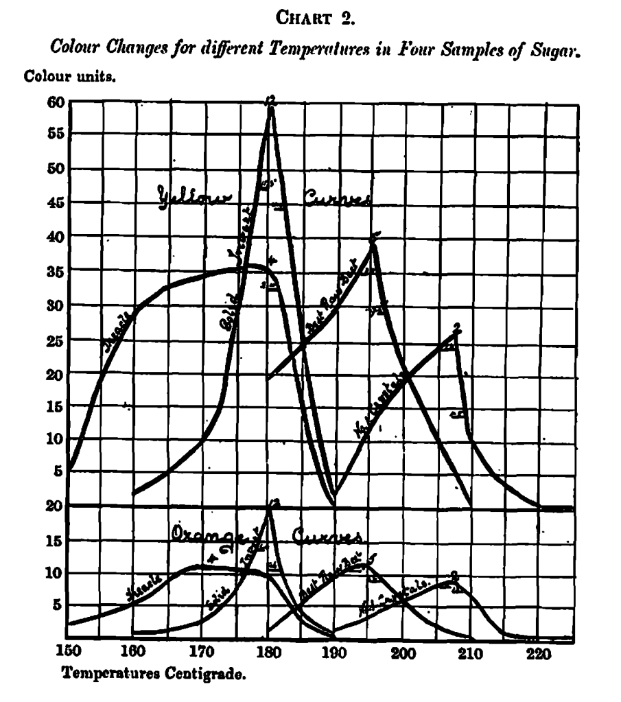 In addition to finding the test caramelising temperature and the cost per unit of colour depth, the same set of measurements supply some information which may be of interest, as it defines the loss arising from temperature fluctuations during manufacture; this is obtained by plotting the set of measurements used in obtaining the best caramelising temperatures on a chart, where the ordinates represent the colour units and the abscissa the temperatures which produce them; the curves so obtained show the loss of colour depth for each degree of variation of temperature from the best possible.