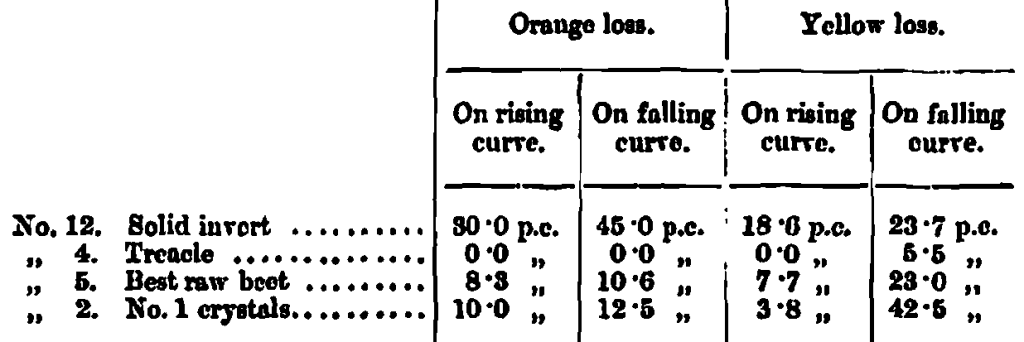 An examination of thee curves show their relative loss of colour depth; the percentages of loss appear in the following table :-
