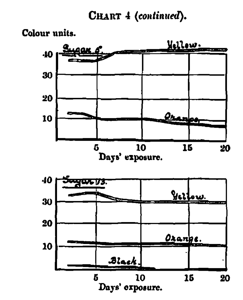 No. 13, from cane jaggery, shows a slight increase in yellow for the first four days, on increased rate of fading for the next four, and practical constancy for the remainder of the term. The orange shows a slight fading for the whole 30 days. I much regret the incompleteness of this section.