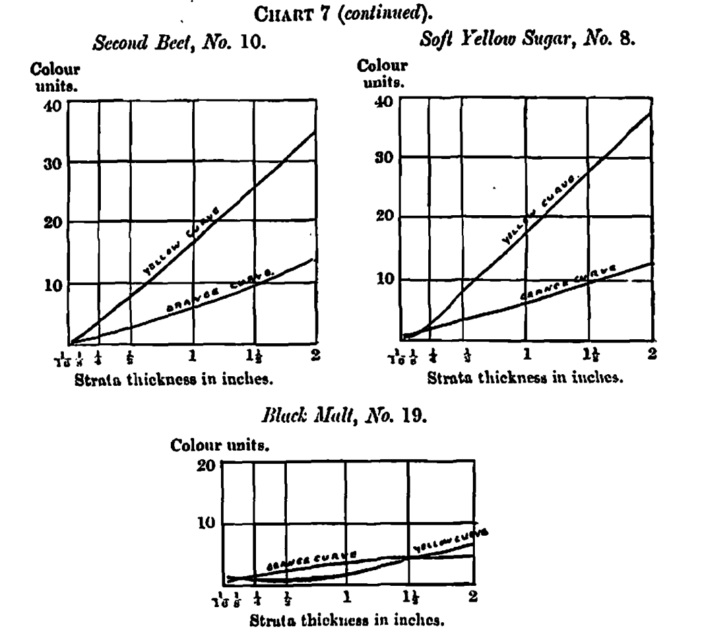The method of establishing specific colour curves of such a substance as caramel, for instance, is quite simple. A percentage solution is first made, then colour measurements are taken at known increasing densities. These are plotted on a chart at those points where the ordinates, which represent colour units, intercept the abscissa which represent strata thicknesses, or densities; then by connecting these points curves are established which are specific for the substance in question.