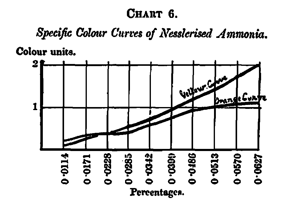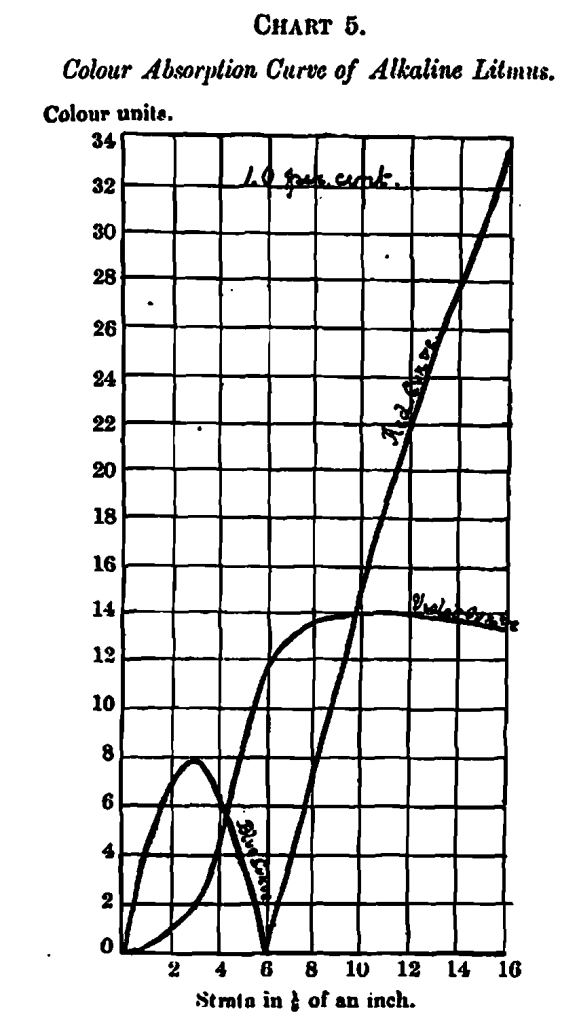Two examples of each curve complexity are shown on Charts 5 and 6 – one containing the colour curves of nesslorised ammonia, arranged according to increasing percentages of ammonia, and the other the curves of a 1 per cent. solution of alkaline litmus. The ammonia curves are comparatively simple, whilst the litmus curves are complex, showing a pure blue only in the initial measurement, after which violet appears in increasing proportions, until at the 6” stratum the blue disappears entirely, being replaced by red. This change of colour from a blue-violet to a red-violet accounts for the difficulty in judging the neutral point between an acid and an alkaline solution when the solution happens to be strong, or what amounts to the same thing, a weak solution in a deep vessel, their visual effect being the same.
