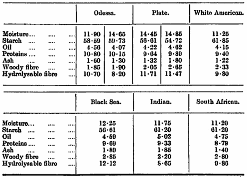 So far as these latter features are concerned, Argentine Plate maize of the right quality is the most suitable for the manufacture of brewing flakes. The following are some typical analyses of maize imported from different countries in which it is grown and will illustrate the composition on arrival in this country.