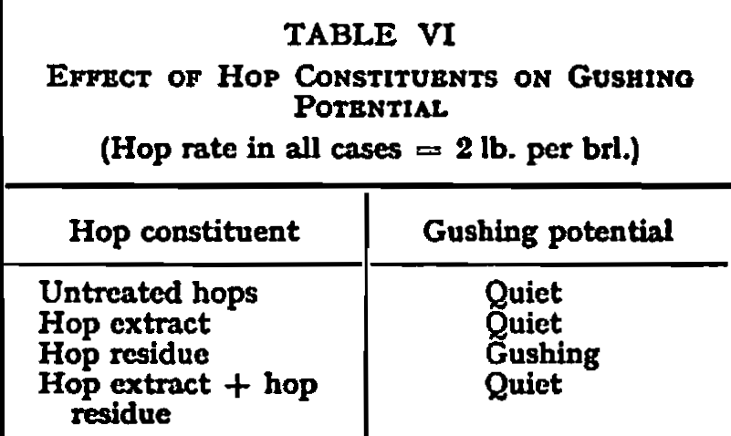 It has not yet been found possible to define hop quality in this context. Towards this end an examination of various hop fractions is being made with a view to assessing their “anti-gushing” activity. In the first series of experiments hops have been extracted with an ether / light petroleum mixture (1:3) and beers have been brewed (laboratory boilings) as in Table VI. Clearly, the anti-gushing factors are present in the material extracted from the hops. This extract is being subjected to further fractionation.