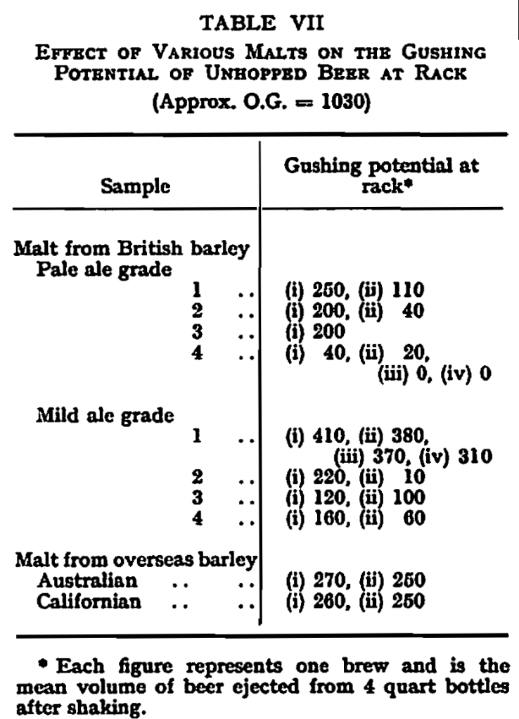 None of the malts examined gave on all occasions an unhopped beer that was completely quiet after being shaken, but one malt was noticeably better than any of the others (Pale ale malt No. 4) and one was rather worse (Mild ale malt No. 1). Work is now in progress to see if the distinctive properties of these two malts are to be associated with the respective barleys or malting processes. Later, it is hoped to isolate a fraction containing the material which apparently plays a major part in causing gushing.