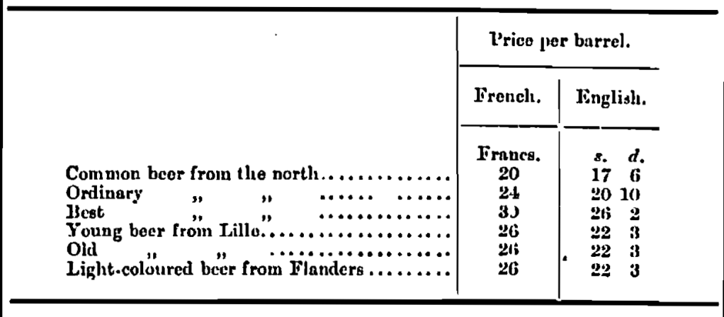 The price per 100 kilos, in francs multiplied by 1·22 will give price per standard quarter in shillings, reckoning 25 fr. = 20s. The hops are from Poperinghe and Bourgoyne. The samples of beer have been chosen as representative of the various types, and the prices are indicated on the labels to afford a means of comparison with English beers; these prices are in francs per barrel of approximately 33 gallons, and have been converted into shillings per standard barrel of 36 gallons.